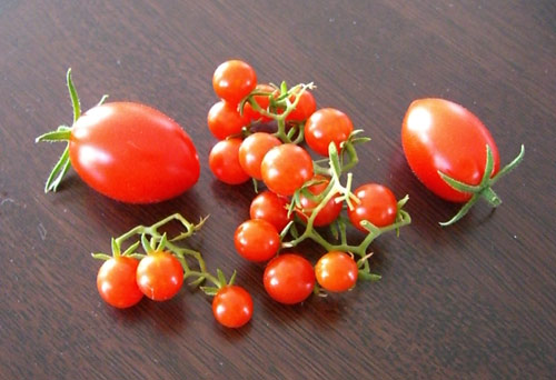 イタリアンレッドとはこのことか?!小さいのはマイクロトマトです。大きさは1センチもありません。料理の飾りやアクセント、カクテルなんかに使っておいしいミニミニトマトです。