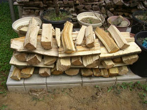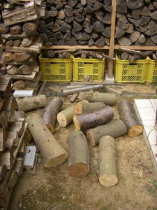 昨日の引越し手伝い第一弾は、重たい廃棄物の搬出と家の外回りの整理。家の外回りは応援を頼んで、2階の屋根の高さほどに延びた木を4本ほど切り倒しました。太い幹の真っ直ぐな部分だけ薪にしちゃおうと30センチちょっとの長さに切ってもらって持って帰りました。