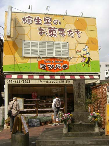 地元では有名なお菓子やさん「ミツバチ」ウィンドウ越しに熱い視線を送っている人がいます。手前の古い石碑がいい感じ。
