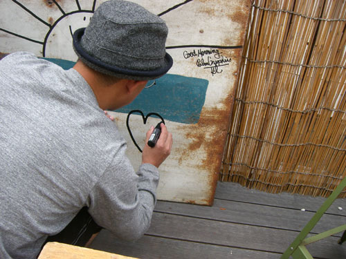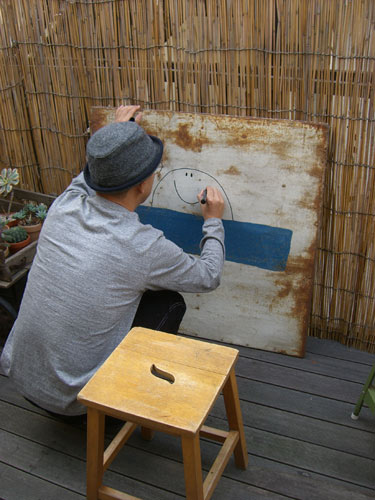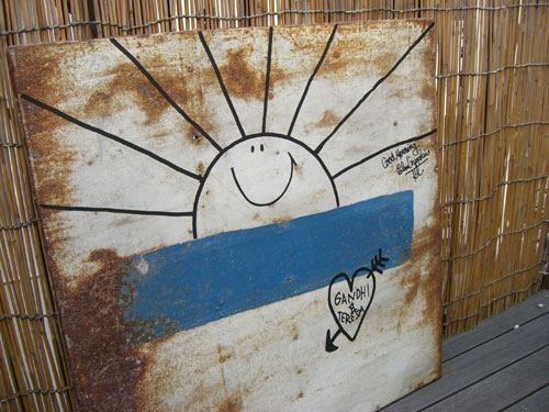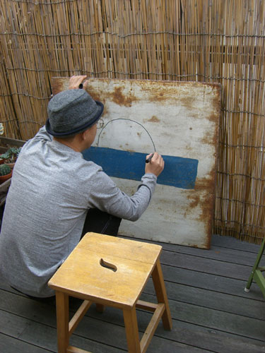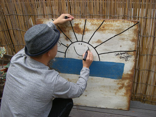 豊田さんは、江ノ島から貰い受けてきた廃材にペインティング。廃材は元看板。貸ボートのボ「ー」か、はたまた江ノ島エスカーのカ「ー」かわかりませんが「ー」を水平線に見立てて、朝日をペインティング。