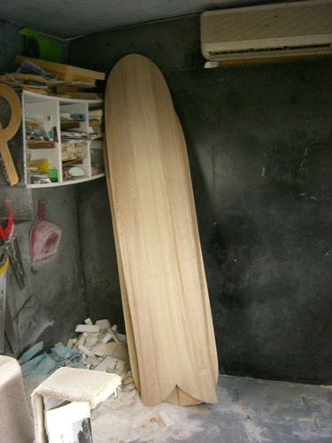 カツさんのシェイプルームには、アライアが数枚。ウッドボードのシェイプ気持ちいいそうです。やっぱり天然素材だからなんでしょうね。私にもパイポをシェイプしていただけるようで、楽しみです。
