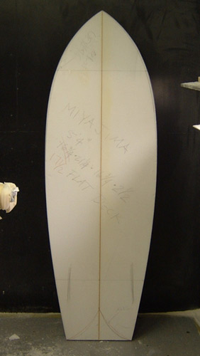 そしてこれは私のニューフィッシュ。結局、ノーズを当初のサイズより3/4インチ広げました。これくらいの方が安心感があります。厚みも若干厚くして、コンケーブを深めに入れることに。かなり短いですが、アウトライン切っちゃったのでもう修正不可能。ノーズよりとレールはギリギリまで厚みを取ってもらうので、浮力はありそうです。グラッシングは重ため。カラーはこれから考えます。これから本格的にシェイプにとりかかるので経過は追ってご報告します。