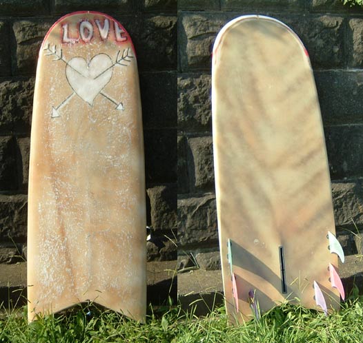 ついに「シモン」がその全貌を皆さんの前に現しました(笑)ごらんの通り、材料はロングボードの折れたノーズ。フィンはどうやら写真の6フィンが一番いいらしい。ボトムはリシェイプされたコンケーブボトム。ノーズをモディファイ中です。ノーズ廻りに赤く見えているのが元のカラー。やたらめったらとフィンが付いている印象。本当に乗れるなんて信じられない?!