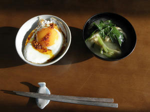 朝ごはんはだいたいこんな感じです。いつもの納豆を買い忘れたので今日は卵のせゴハン。桃屋の「辛そうで辛くない少し辛いラー油」を卵の上にたらしました。