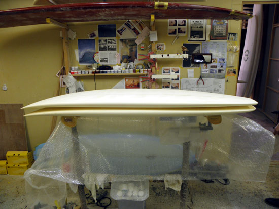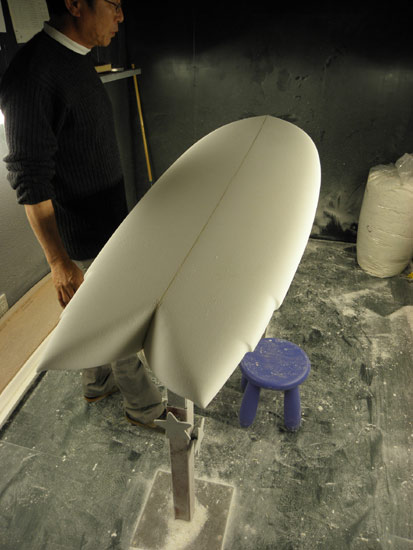 ロングボードから始まって、米軍ベースに忍び込んで(?)見た、「EVOLUTION」でボードはどんどん短くなって、トライフィンの時代。南の島の危険なホローウェイブに魅せられて、その波のためにシェイプされていたスペシャルクィーバー、そして地元湘南の波で楽しめるスペシャルシェイプ。力の弱い波からもスピードを楽に引き出せるアウトライン、ロッカー、ボリュームのバランス。ファットな外観からは想像がつかないほど細かい部分まで、理論的な裏づけと経験が活かされたシェイプが施されています。