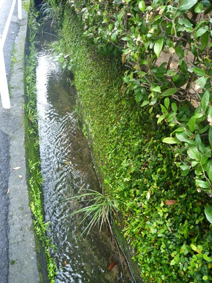 山に降った雨を中心部の平地へすみやかに流し込むためなのか、大小の水路をあちこちで見かけます。水とまわりの緑がきれいです。水路の透明な水の流れと緑は私にとって長崎らしい光景。