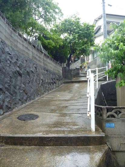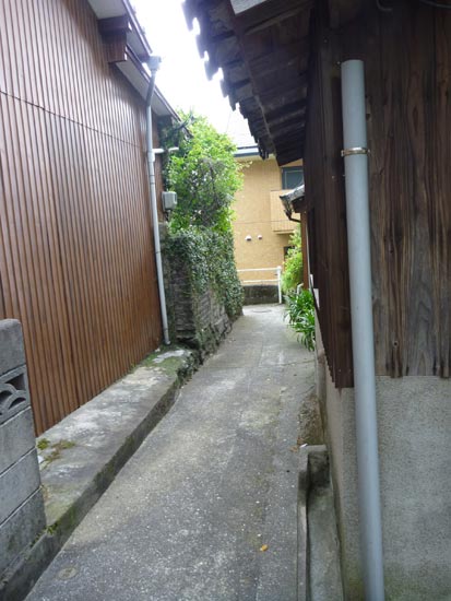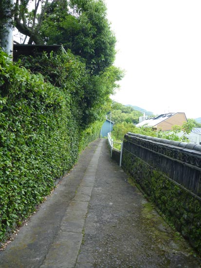 高台にはこんな細い道が民家の間を縫うように通っています。車もバイクも自転車も通れない山道のような生活道路。これも極めて長崎らしい光景。