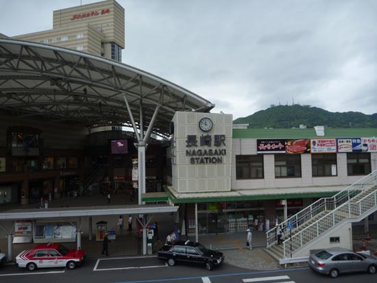 長崎空港から長崎市内行きの高速バスに揺られること約40分とちょっと、JR長崎駅に到着しました。駅の向こうには、テレビ塔が立つ稲佐山が見えます。長崎らしい風景ですが、長崎駅も昔とはだいぶ変わりました。