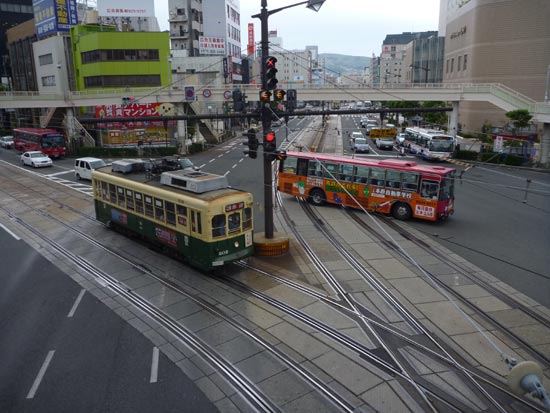 長崎は雨が多いと言うのは大きな誤解ですが、雨が似合う街だと思います。路面電車の軌道は道路の真ん中。電車も信号を守ってクルマと一緒に走ります。線路上は雨の日は滑り易いので単車注意。