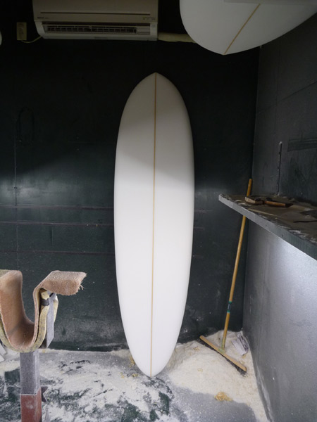 Mさんの8フィート、ミニノーズライダー完成しました。ピッカピカです。全体のボリュームはノーズライダー。ノーズのボリュームもたっぷりなので、パフォーマンスタイプの9フィートのロングボードよりも滑り出しは速いでしょう。