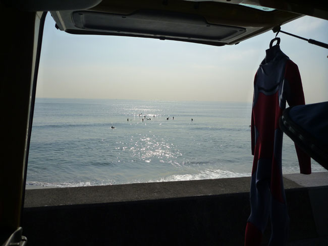 そのあとは昼時に引く潮を狙ってランチタイムサーフ。東うねりが房総半島に引っかかって相模湾にも入ってきています。千葉で炸裂している東うねりもここではヒザ・モモ。でもロングボードなら十分楽しめます。