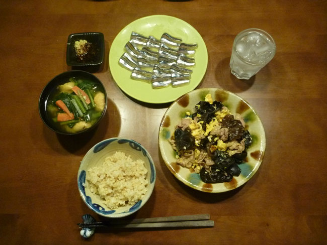 そして晩ご飯は朝から水でもどしたキクラゲと豚と卵の炒め物。それにキビナゴの刺身。キビナゴ、長崎に住んでいたころはよく食べました。コリリとしたキクラゲとキビナゴが好物なのでした。