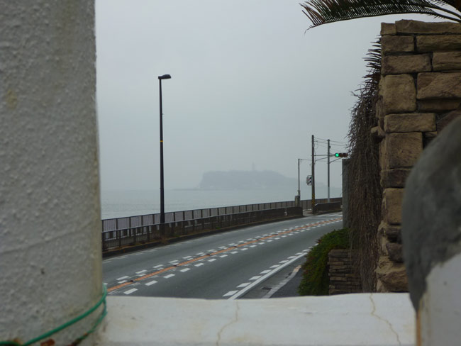 12月1日。雨。気温は昨日よりも10°以上下がりました。江ノ島もぼんやりです。