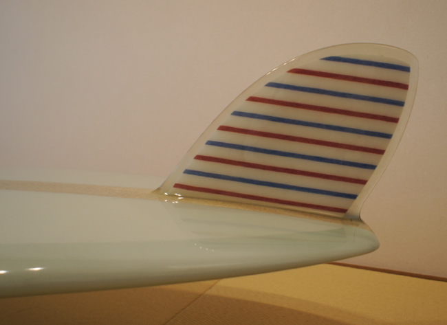 フィンはボーダー柄のクロスをインレイしました。フィンの根元のロービングは厚ぼったく樹脂を盛ってもらいました。