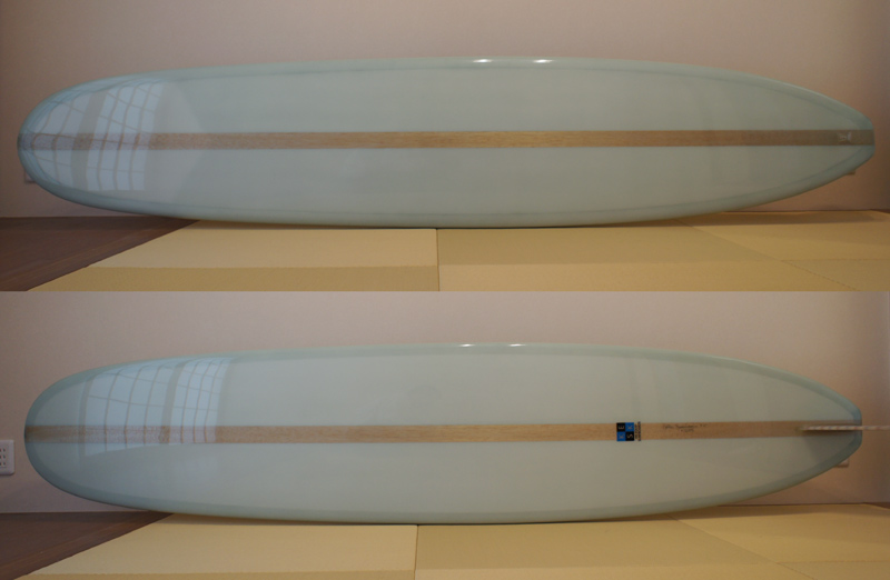 サイズは、9’x 22”1/2 x 3”1/4 デッキ側のノーズの少しうしろからテールまで補強のクロスを入れました(色が変わっているところです)ボトムも通常のラミネートより一層クロスを増やしています。