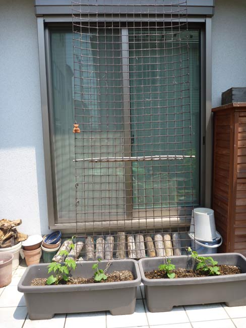 寝室の前にグリーンのカーテン準備完了です。ゴーヤを植えました。いっぱい実を付けて、日差しを遮ってちょうだい。