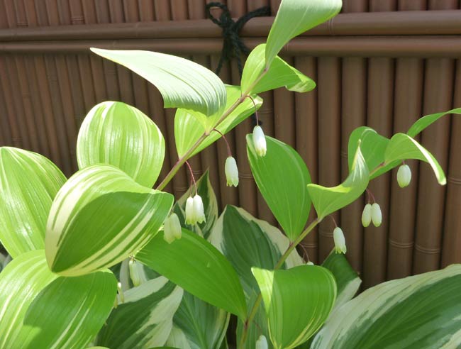 ナルコユリも咲きました。控えめな花ですがハチたちには人気です。斑入りの葉がきれいです。