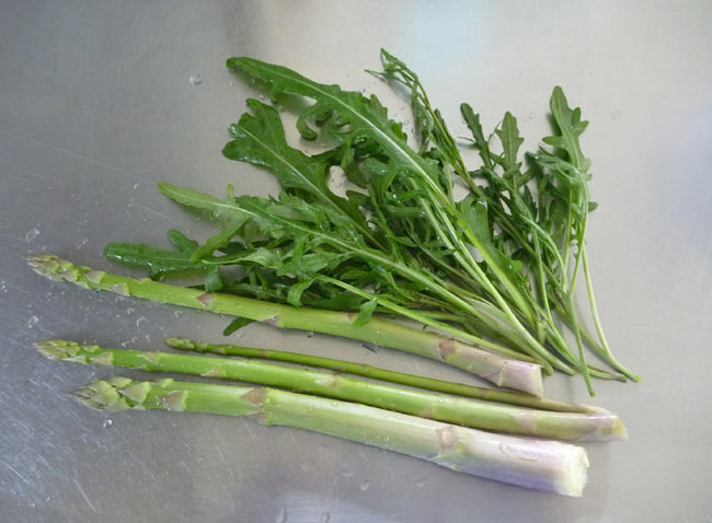 毎朝、獲れます。春アスパラとワイルドルッコラ。アスパラは春先から夏にかけて収穫できますが、春先のアスパラが一番美味しいです。旬のアスパラ食べましょう。