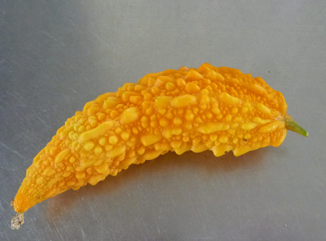 写真解説 上:キュウリを収穫したら花がまだきれいに咲いていました。 下:ゴーヤが熟れてきれいなオレンジ色に。ゴーヤチャンプルには出来ませんが、中の真っ赤な種をしゃぶるとほんのり甘くて和みます。