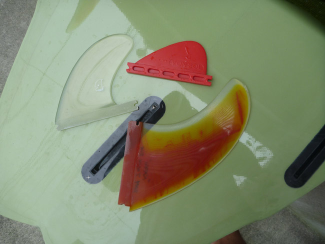 オレンジ色の大きいのがサイドフィンですが、これもフューチャーからいろいろな大きさのものやハイテク(?)フィンも出ているので、手に入れて試してみたいと思ってます。次のニーボードを作るのにも役立ちそうに思います。
