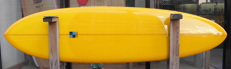7’3”はライトブルーティントのデッキにエクストラクロスでアクセントを付け、ボトムはイエローとライトグレイの二色で塗り分けました。ウェブで色使いを再現するのが難しい微妙なカラーです。実物を見に来てください。