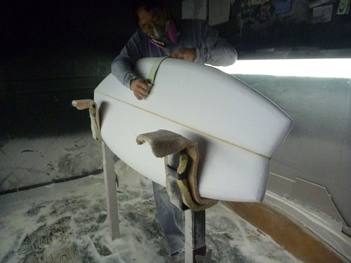 アウトラインをシューフォームで整え、今度はデッキ側をプレーナーで削ってレールのラフな形状を作り、ボードの厚みを調整します。