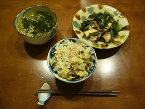 今が旬のワカメをいただいたので晩ご飯はワカメづくしです。茎ワカメと豚バラの炒め物、タケノコとワカメのまぜご飯にワカメのニンニクスープです。春の味です。ごちそうさまでした。うまかったです。