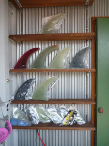 シェイプルームの入り口の横にはフィン置き場ができました。ここにカツさんのオリジナルテンプレットのフィンが並びます。