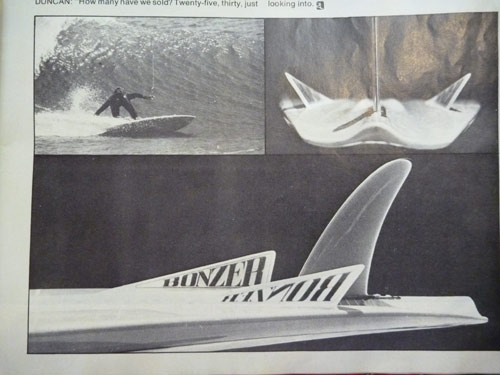 サイドのウィングは通常のサイドフィンよりも寝かせ気味の角度で取り付けられています。ターンのときにより波に対して垂直に近い角度を得るためです。サイドのフィンが二つに分かれて5フィンになったのは80年代になってからです。
