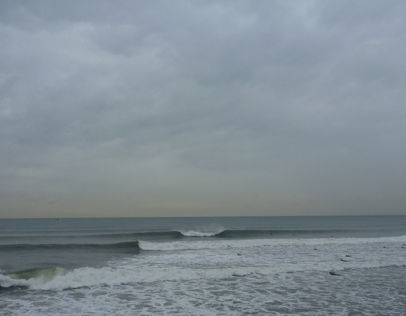 潮の引きを待って入水。潮が多くて割れにくかった朝にくらべてコンスタントに割れはじめました。潮の動きは海から遠ざかっているあいだに夏から冬のそれに変わっています。波はムネカタアタマのファンサイズです。