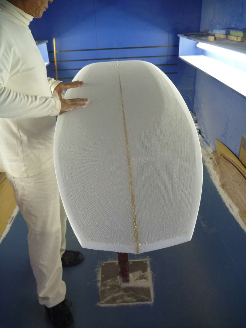 カツさんはビギナーさん用のロングボードをシェイプ中。ボトムのプランシェイプがよくわかります。ビギナーさん向けなので安定性を重視してフラットな部分を残すそうです。