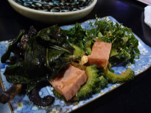 ここでも、しーぶん。ゴーヤチャンプル、苦菜のあえものになんかの野菜。