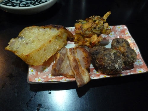 紙袋の中からはいろんなテンプラがごろごろ出てきますが旅人で一見さんの私は遠慮。そうするとまた隣のおっちゃん、「頼んだもの以外はタダだから」