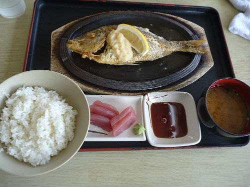 魚のから揚げデカイです。刺身はマグロ。上のそばランチにも付いてますが、近海ものらしくこっちのマグロとちょっと違いますが、食べつけると美味しくなってきます。