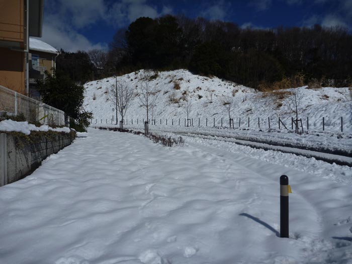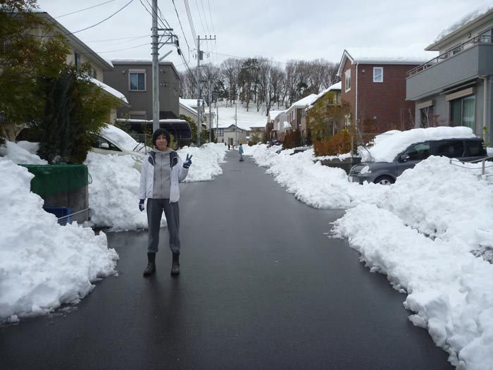 雪には不慣れとは言いつつも、普段から妙に雪が多い我が家のまわりは私もご近所さんもそれなりに慣れてきたらしく、午後にはすっかりこの状況。駅までの道のりも安全に歩けるように皆で雪をどけ、道を作ってしまいました。