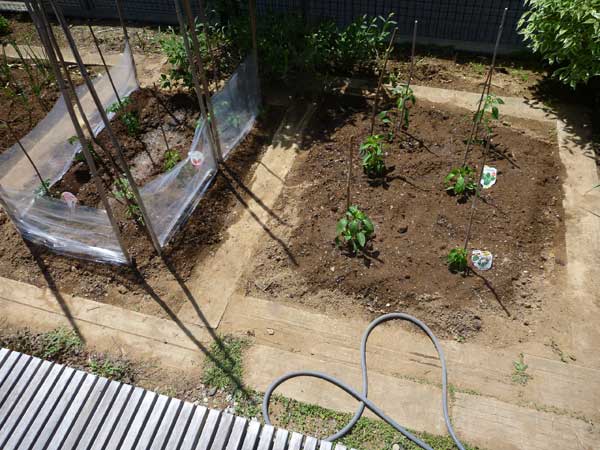トマトの苗はまだひ弱なので、風除けにビニールを張りました。右側の区画はトウガラシ。そのまま食べられる甘長系と、辛い日光トウガラシ、札幌なんばん もうひとつは忘れましたが、我が家はトウガラシ好きです。