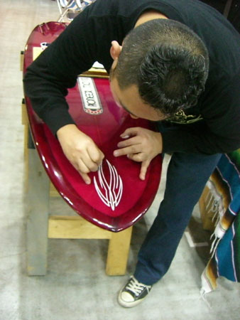 画像はKEN THE FLATTOPさんのブースにて撮影。ボードのノーズにピンストライプを入れているところです。フリーハンドで左右対称に少しのブレも無く同じ太さでストライプを引いていきます。スーパーテクニック。