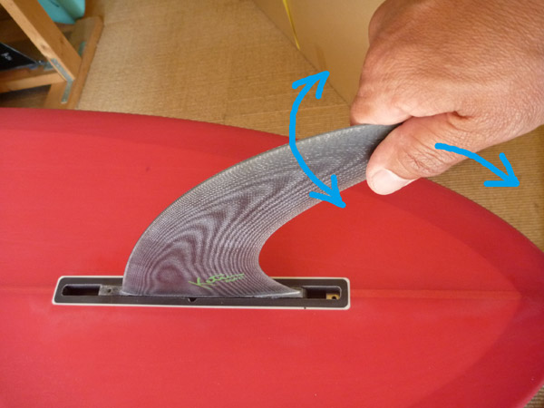 ボードを安定が良い場所に置いて、フィンの先端を握り、左右に揺らしながらフィンが外れる方向へひっぱります。(写真は後ろへ引きつつ左右に振っていますが、ネジが後ろだったら持ち上げる方向にひっぱることになります)