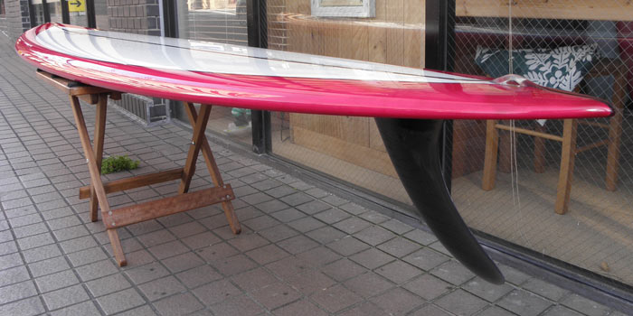 ニューボード。サイズは、8’6”x 20” x 2”7/8~3”。レッドウッドのストリンガーに会わせて、ピンラインとロゴマークを黒にしました。マジェンタが少し混ざったような赤のティントを引き締めてます。