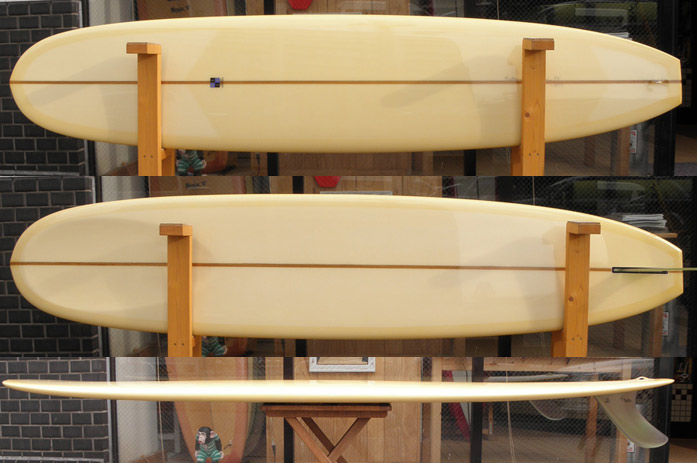 タカヤマさんのスコーピオンです。長さは6’6”。映画のタイトルがすぐに思い出せないのですが(ハル・ジャプセンだったかしら…)、60年代のマリブでタカヤマさんが短い短いボードに乗って、コンテストに出ている映像があるのですが、そのときのボードがまさにコレ(映画のボードはシングルでしたが)