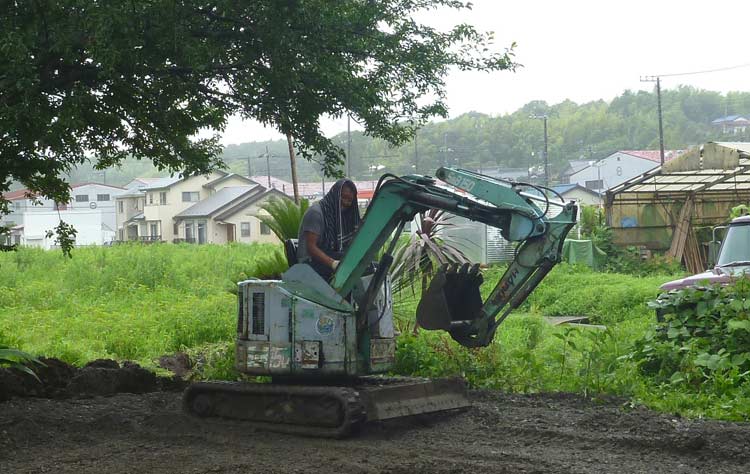 カツさんのロングボードのライダー。プロロンガーの石坂健プロは雨の中整地作業。何でもやっちゃいますね。