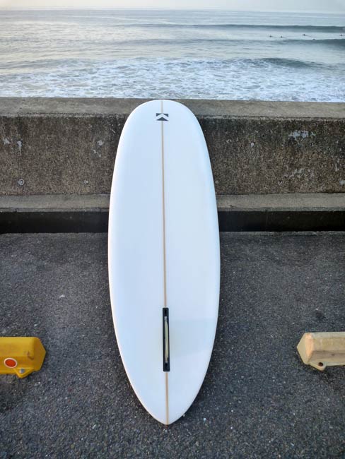 8’4”のプリモは、ロングボーダー向けのミッドレングスだと思います。普段シングルに乗っている人がログではちょっと大変、というときに使うと面白いと思います。もっと動かしたいという人にはサイドフィンを付けちゃいます(シェイプも変わります)