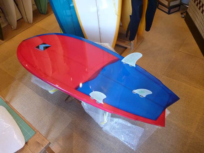 カツさんは小さな小さなシングルフィンモデル、DISHをシェイプ中です。長さは5’6”。シングルフィンですがレールとコンケーブの組み合わせでシングル以上に良い動きをしてくれます。