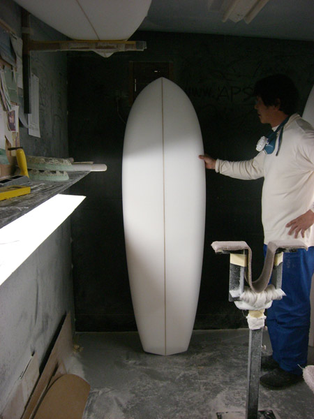ボードが2本出来上がりました。ひとつは、MINI5。MINIモデルをベースにした、5フィンのボンザーです。