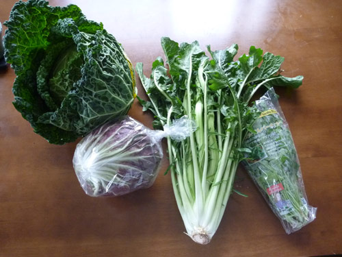 サボイキャベツにラディキオ(トレビス)、プンタレラ、ワイルドルッコラです。どれもひと癖あっておいしい野菜です。