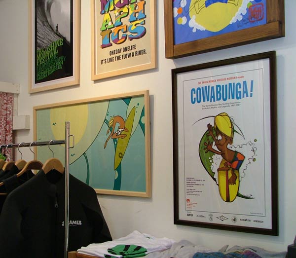 いただいたアンディ・デイビスのポスターが店にあったフレームにちょうど良さそうだったのでフレーミングしてみました。ウェットスーツのバックにいい感じです。カッコいいでしょ?手前にはマーフィイ君のポスター。こちらの生みの親はリック・グリフィン。このポスターは最後の一枚なので非売品です(ゴメンナサイ)このポスターはふとしたことから知り合いになった製作元であるサンタモニカミュージアムの方に直接譲ってもらったものです。5枚ほど送ってもらったのですがさすが美術館、梱包を解いてみるとシワ一つないウルトラミントのコンディションでした。4枚は販売したわけですがお買い上げいただいたみなさま、アメリカにもこれほどのコンディションのものはもう存在していません。大切にしてください。