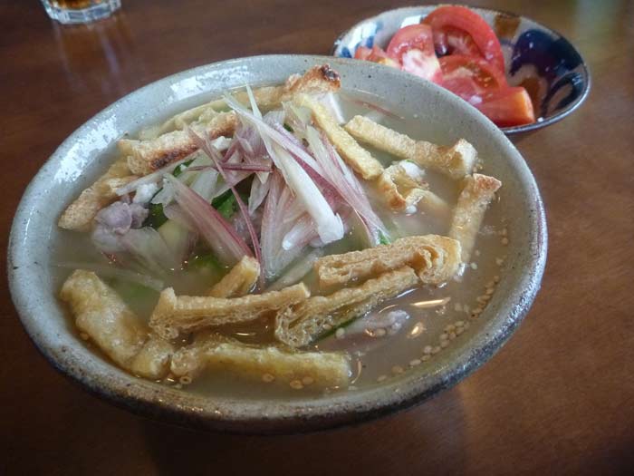 前の晩に棒棒鶏を作った鶏のゆで汁と、鶏肉を少し取っておいて冷たい鶏スープ仕立てにしました。固まった脂は取り除き、梅肉をたたいて溶かして、塩と醤油で味付け。キュウリと豆腐はおんなじです。