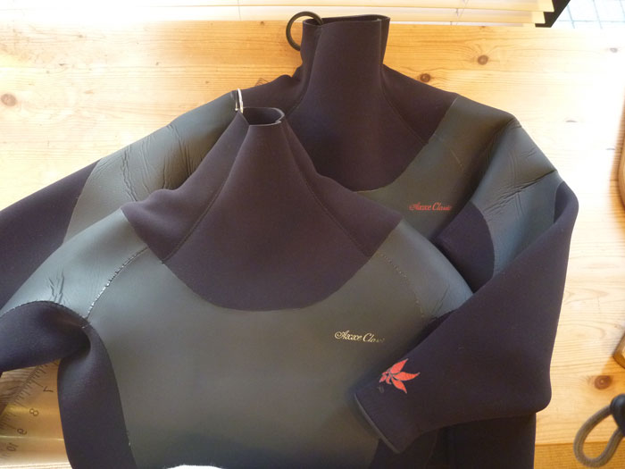 メンテナンスをお願いしていた、AXXE CLASSICのウェットスーツが戻ってきました。それぞれ、2012年と2013年にお作りした、セミドライのネックインフルスーツです。