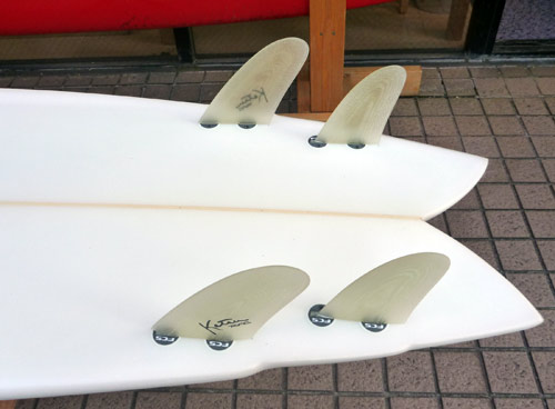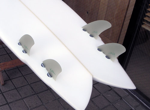 デフォルトでお付けしているのはこれです。FANG(キバ)と呼んでいるフィンです。後ろが小さいのでフィッシュのセッティングではちょっとルースする感触が好きなのです(同じフィンを使ってもテールの形状とフィンを付ける位置で変わってきます)