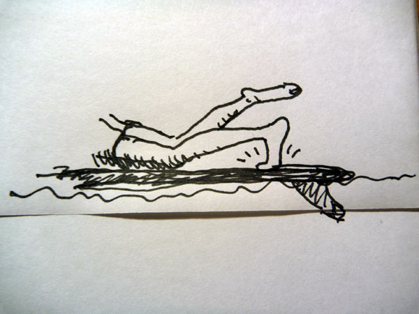 波乗りの手引き書では、かならず最初の方に出てくるやつです。波をつかまえボードが滑り出したら、身体の横に両手をついて、上体を持ち上げ、腹ばいの状態の両足を身体の下へ引き込んで立ち上がる動作です。